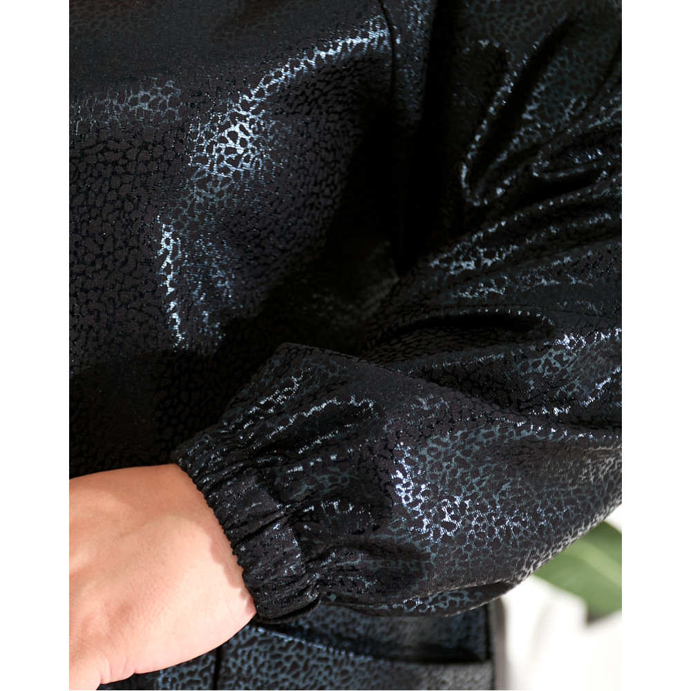 Чорна кофта з щільного трикотажу з лаковим напиленням - комфотр і стиль в одному. Еластична тканина чудово тримає форму, а легкий блиск додає образу сучасності.