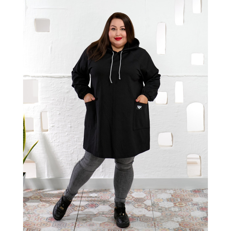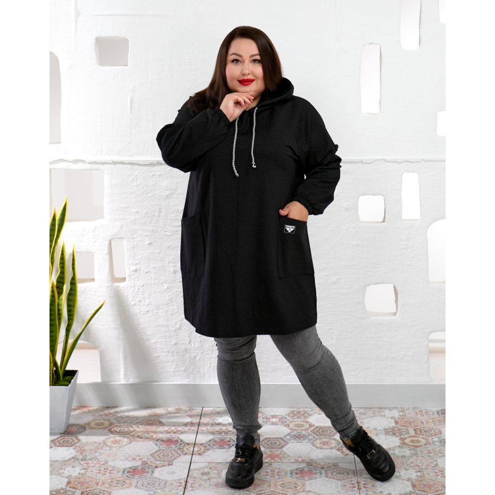 ​Тепла туніка в класичному темному кольорі — ідеальний вибір для тих, хто цінує затишок та стиль. Модель пошита зі щільного і приємного до тіла трикотажу, який чудово тримає форму і зігріває в прохолодну погоду. Тканина має цікаву текстуру — дрібний, ледь помітний горошок, що додає виробу оригінальності.