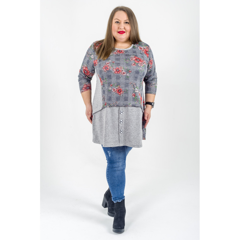 Туніка 3312-3 сірого кольору з кораловими трояндами та декоративними гудзиками